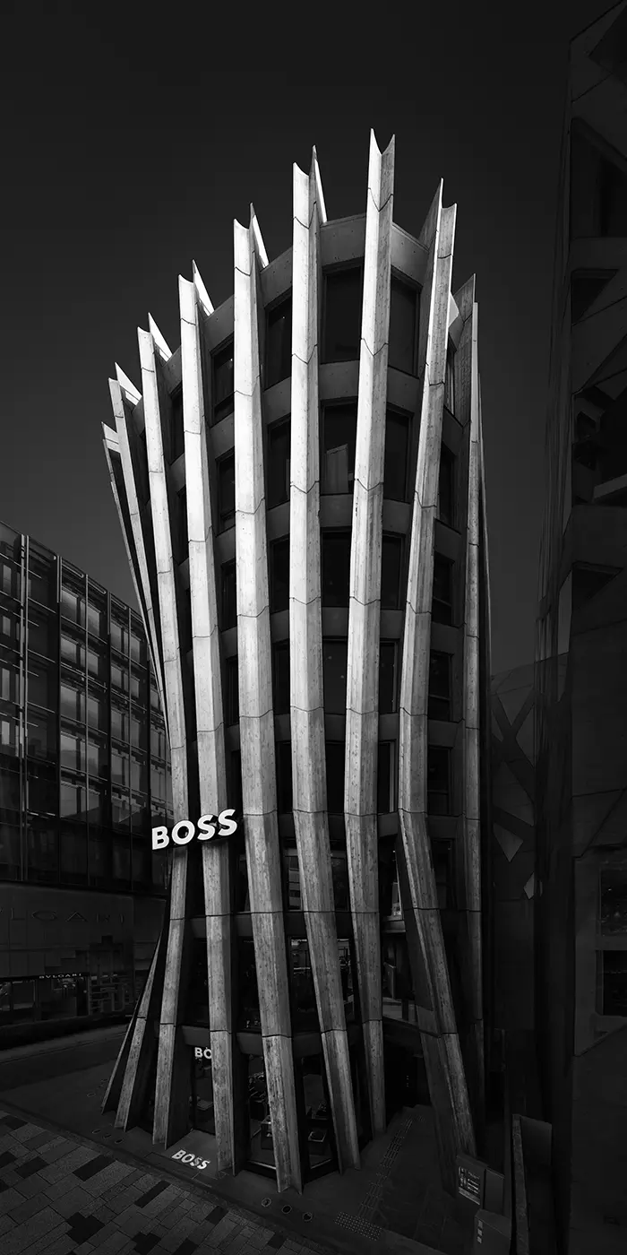 The image in this photograph depicts the Hugo Boss store, a remarkable example of modern architecture in the Omotesando District of Tokyo.